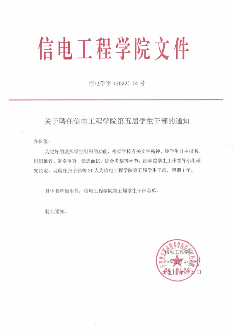 关于聘任信电工程学院第五届学生干部的通知
